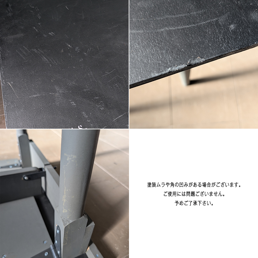 ※あくまでも折り畳み式の簡易テーブルです。天板に過度な負荷をかけたり、 衝撃を与えると変形、破損する場合がございます。ご使用にあたっては十分ご注意ください。若干の傷、塗装の掠れ等ございます。