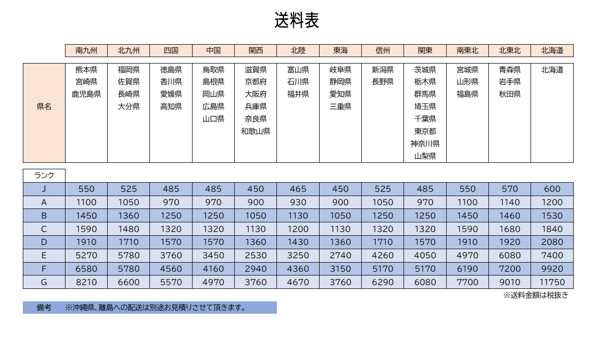 下記に送料表を掲載しております。